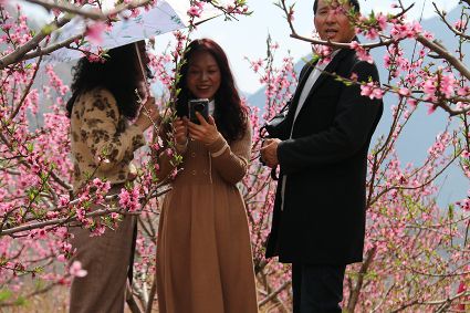 這個(gè)時(shí)節(jié),著名的賞花之地當(dāng)屬瀘定縣冷磧鎮(zhèn)杵坭的桃花谷。從瀘定縣城出發(fā),沿著大渡河右岸一路往下,行約20分鐘就能看到美麗的田野景色。只見,山頭上,田野間,或是房前屋后,統(tǒng)統(tǒng)換上了美麗誘人的春裝。放眼望去,李花、桃花、油菜花競(jìng)相綻放,爭(zhēng)奇斗艷。這里,桃花尤其繁盛,沿著山谷錯(cuò)落有致、次第盛開,讓人目不暇接,用一步一景來(lái)形容也一點(diǎn)不為過(guò)。