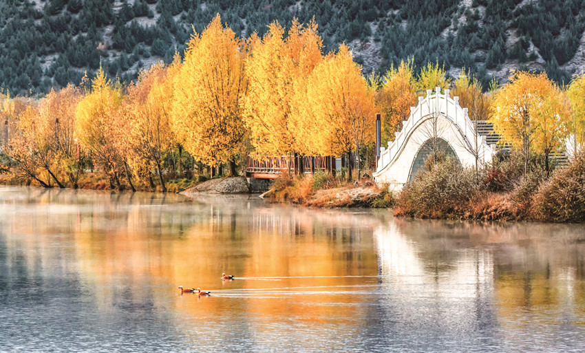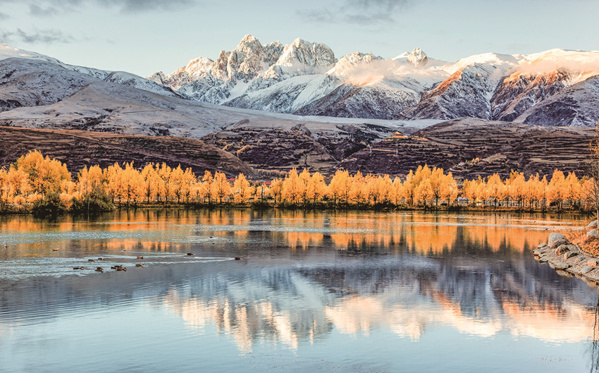 除了巍峨的雪山與彩林作伴,不少越冬的候鳥也飛抵珠牡湖。金色彩林倒映在清澈如鏡的湖面上,不時(shí)有候鳥游過,激起層層漣漪,為珠牡湖增添了不少生機(jī)與趣味。