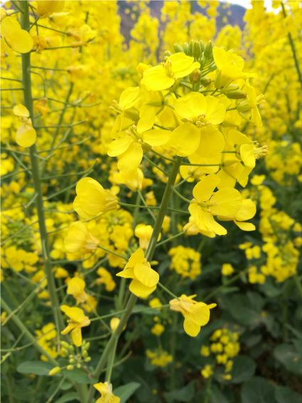 油菜花是我兒時(shí)的記憶,外婆為了生計(jì),總會(huì)在家門(mén)口的幾畝菜地里滿滿當(dāng)當(dāng)?shù)姆N上油菜,菜花開(kāi)的時(shí)候,我就會(huì)端上一根長(zhǎng)板凳、一根方板凳坐在油菜花前寫(xiě)作業(yè),油菜花的清香伴我度過(guò)了整個(gè)童年。記得兒時(shí),每逢春季,田野里都會(huì)被一簇一簇的油菜花裝扮的金黃,大片的花兒披著一層金裝,偶爾一陣清風(fēng),大地上便掀起了片片的漣漪,烈陽(yáng)下金光燦燦,甚是好看!