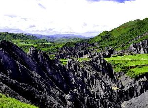 墨石公園,是中國(guó)唯一高原石林景觀,被譽(yù)為“中國(guó)最美景觀大道第八美 ”。受第四紀(jì)新構(gòu)造運(yùn)動(dòng)影響,隨著青藏高原的隆起,鮮水河斷裂帶中的巖石受到擠壓、剪切、破碎、糜化,形成糜棱巖石林。石林含丐鹽,受空氣濕度影響,干燥季節(jié)呈淺灰色、淺藍(lán)色,濕潤(rùn)季節(jié)呈滄黑色,因此又稱之為變色石林。