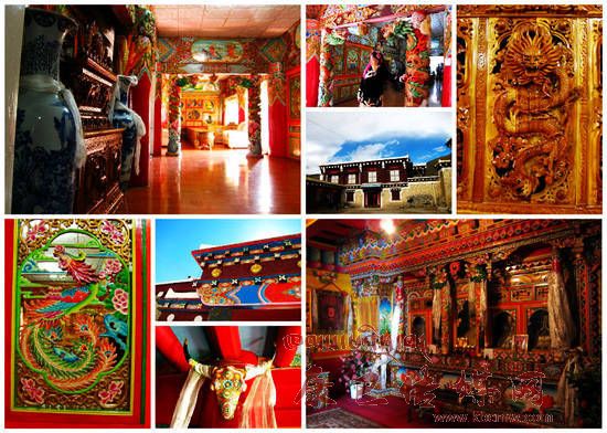 這些民居外表主要由棕白兩色構(gòu)成,白色的屋頂,白色的主墻,木結(jié)構(gòu)處多用棕色顏料染涂,其間配以紅、藍(lán)圖案,在藍(lán)天、白云、青山、綠水的映襯下,幻化成妙不可言的積木圖案。白色的房頂與寬敞的院壩里,身著艷麗藏裝的少女或身著絳紅色衣衫的喇嘛飄拂其間,給人一種“世外桃源”的感覺。