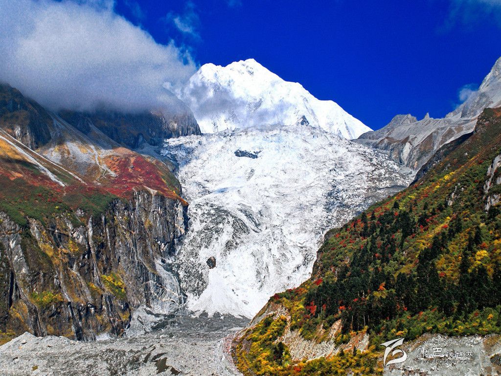 海螺溝位于四川省甘孜藏族自治州東南部,貢嘎山東坡,是青藏高原東緣的極高山地。海螺溝位于貢嘎雪峰腳下,以低海拔現(xiàn)代冰川著稱于世。晶瑩的現(xiàn)代冰川從高峻的山谷鋪瀉而下。海螺溝是亞洲最東低海拔現(xiàn)代冰川發(fā)現(xiàn)地,海拔2850米。其大冰瀑布高1080米,寬0.5米-1100米,是中國至今發(fā)現(xiàn)的最高大冰瀑布。溝內(nèi)蘊藏有大流量沸熱溫冷礦泉,大面積原始森林和高的冰蝕山峰,大量的珍稀動植物資源,金山、銀山交相輝映,蔚為壯觀。