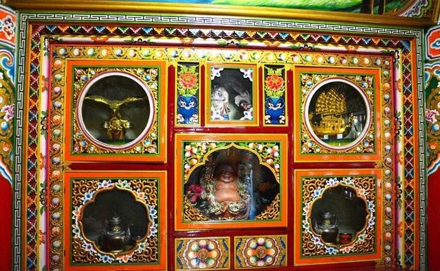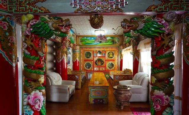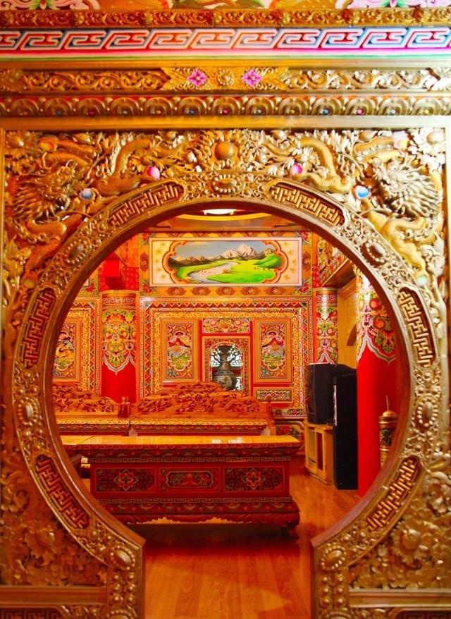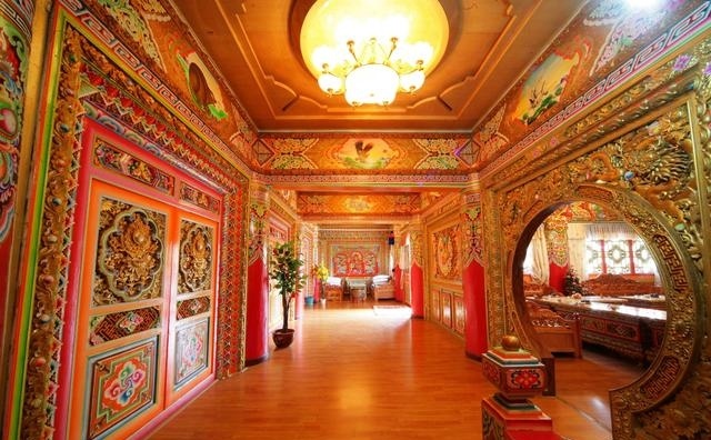 道孚民居室內(nèi)精雕細(xì)鏤,描金繪彩,每一個(gè)圖案或圖畫(huà)就是一個(gè)吉祥物或一個(gè)傳說(shuō)。民居客廳陳設(shè)豪華,富麗堂皇,極顯主人的富有;經(jīng)堂供奉佛像,酥油燈長(zhǎng)明,是家中的清靜之地;臥室多用箱式或椅式藏床,陳設(shè)溫馨而別具風(fēng)情。