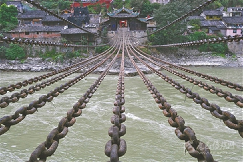 “瀘定橋”有人又稱“鐵索橋”。相傳康熙帝統(tǒng)一中國后,為了加強川藏地區(qū)的文化經(jīng)濟交流而御批修建此橋,并在橋頭立御牌。1935年,中國工農(nóng)紅軍在長征途中“飛奪瀘定橋”,使之成為中國共產(chǎn)黨重要的歷史紀念地。1961年,瀘定橋被中華人民共和國國務(wù)院公布為第一批全國重點文物保護單位之一。瀘定橋全長103.67米,寬3米,由橋身、橋臺、橋亭三部分組成:橋身由13根碗口粗的鐵鏈組成,左右兩邊各2根,是橋欄,底下并排9根,鋪上木板,就是橋面。每根鐵鏈由862至997個由熟鐵手工打造的鐵環(huán)相扣,總重量達21噸。