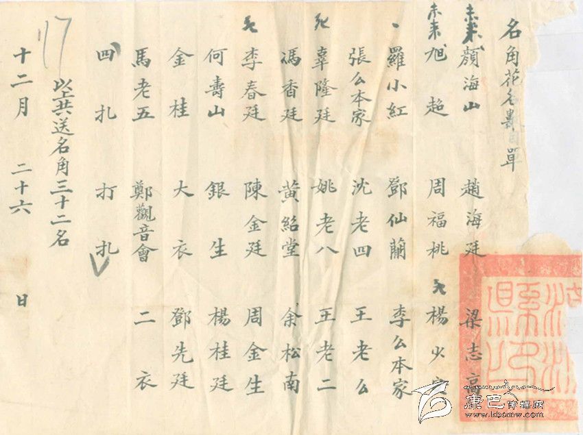 不準賭博做什么呢?當(dāng)時的當(dāng)權(quán)者還是費了一番心思,他們從外地請來了一個川戲班子,為了吸引人們關(guān)注,康定縣政府把戲班的名角以及配角演員名單寫成海報張貼到街頭,又抄成傳單廣為散發(fā),用現(xiàn)在的話說是,做足了戲班出場前的前期宣傳工作。從名單上看,這是一個不小的戲班子,所謂名角竟有32名之多。想來對于沒有多少文化生活的康定民眾,還是有一定的吸引力。