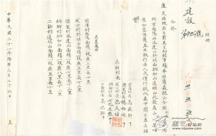 布告張貼出去后,大渡河流域康定縣屬的前溪、德笨、納腳、威公、二朗等五個村長向縣政府寫出了由自己親自簽名畫押的“具結(jié)書”,把自己村落所在地的林林面積造出表冊“具呈”,并保證“以后加以保護,不敢仍由人民自由砍伐”。