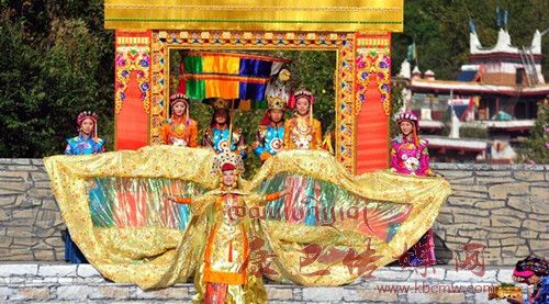 在催人奮進(jìn)的戰(zhàn)鼓聲中,一群身披甲胄的士兵拿著長劍,背著巨弓走到臺前,在鏗鏘的戰(zhàn)鼓聲中,戰(zhàn)士們做著各種競技動作,模仿武士們互相攻擊的樣子,那矯健的身影展示了遠(yuǎn)古時代嘉絨藏族先民們?yōu)榱松媾c自然努力抗?fàn)幍膱鼍啊_^了一會兒音樂一轉(zhuǎn),戰(zhàn)鼓聲漸漸減弱,在鳥雀的陣陣啾啾聲中,一座木門慢慢的開啟,一位身披長袍、頭戴鳳冠的女王在眾多美女的簇?fù)硐?,緩緩走下臺階步入舞臺中央,此時,一位手捧托盤的老者來到女王面前單膝下跪,將托盤高舉過頂,并邀請女王品嘗佳肴,女王將中指在酒中蘸了蘸,并曲起中指向四周輕輕彈去,寓意愿將杯中美酒與四方百姓同飲。在女王面前還放置著一個凈水桶,桶中盛滿了清澈的甘泉,桶上橫放著一枝柏樹枝,女王伸出纖纖玉手,拿著柏樹枝在水中蘸了蘸,面向墨爾多神山撒去,寓意向神山祈福。這是此次《美人谷·丹巴》節(jié)目展演中的序曲部分,有著強(qiáng)烈的東女神韻,將遠(yuǎn)古時代東女國女王遺風(fēng)展演的淋漓盡致。