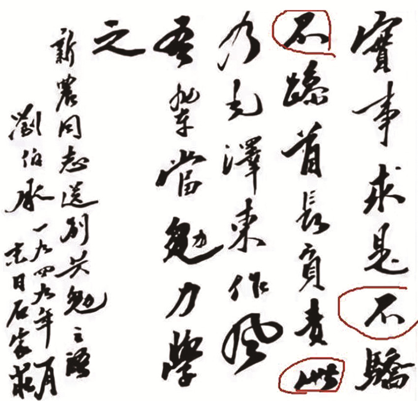 以上是劉帥1949年的書法,距離1936年13年的時(shí)間,“不” “此”二字,明顯與布告上的風(fēng)格一致。國、合、軍等單個(gè)的字,在建國后的書法作品與布告比較,都可以在劉帥其他書法中看到明顯出自一人。