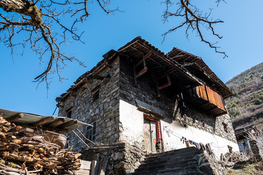 魚通人的房屋符合古人對居所背山面水的要求,多依山而建。房屋為木石混合結(jié)構(gòu),以片石木材和黃泥為主要材料建成,當(dāng)?shù)厝朔Q之為“碉房”。房屋用石塊壘起,以木頭為墻筋,每隔一定高度,橫砌進(jìn)入石塊,融為一體,使之更為堅固牢靠?!暗锓俊?/span> 一般為三層或四層,呈四角或六角形。底層為關(guān)牲畜。第二層為“堂屋”, 在過去,是集做飯、吃飯、烤火、家人日?;顒訛橐惑w的場所,地上設(shè)有火塘、灶,并在火塘上設(shè)石制三腳鍋莊或鐵三腳。第三層為各居室,有的設(shè)有貯藏室和會客屋。頂層為經(jīng)堂,室外為曬壩,作打場、曬場用。有些在外側(cè)設(shè)有一小吊腳樓,可堆放雜物。隨著時間的流逝,古老的碉房已無法滿足現(xiàn)在居民的需求,已很少有人居住,而新式碉房在傳統(tǒng)的基礎(chǔ)上開始出現(xiàn)。
