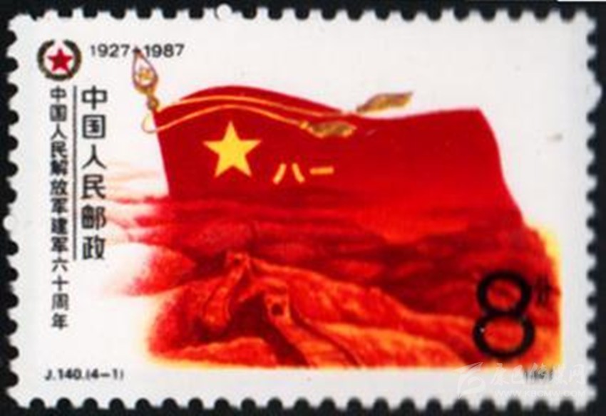 197781日原郵電部發(fā)行的《中國人民解放軍建軍50周年》紀(jì)念郵票,其中第4枚“雄師過大江”,圖案中一名沖在渡江隊伍前面的戰(zhàn)士高舉一面“八一”軍旗。198781日原郵電部發(fā)行的《中國人民解放軍建軍60周年》紀(jì)念郵票一套4枚。其中第1枚“軍魂”,郵票上一面鮮紅的“八一”軍旗迎風(fēng)飄揚,旗下是蜿蜒的萬里長城,代表了中國人民解放軍是保衛(wèi)祖國和人民的“鋼鐵長城”。199581日,原郵電部試發(fā)行一套“義務(wù)兵專用”郵票一套1枚,票名為“神圣的使命”,圖案以紅光四射的“八一”軍旗為背景,以現(xiàn)代化的飛機、坦克、火箭和象征和平的白鴿為襯托,畫面是威武的陸海空三軍,顯示我軍鋼鐵長城般攻無不克、戰(zhàn)無不勝的精神風(fēng)貌。