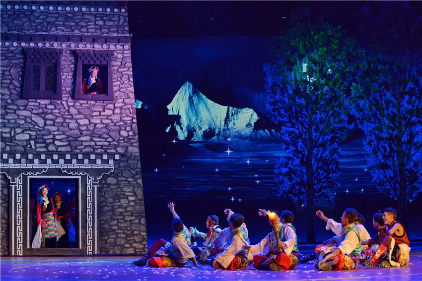 第二場 《慧明》,圍繞亞丁央邁勇(文殊)神山文化,用歡快的歌舞藝術(shù)展示幸福生活的智慧。把民俗舞臺化,舞蹈儀式化,對雪山、江河表達感恩敬畏之情,體現(xiàn)人與自然和諧相融,對生態(tài)保護的尊重。同時通過傳統(tǒng)歌舞和自然風(fēng)光相融合展示藏民族特有的淳樸和快樂。