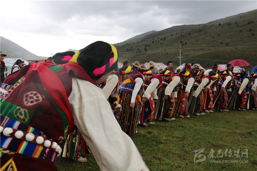 10月2日,在木雅鍋莊悠揚(yáng)的旋律和輕盈的舞步中,歷時(shí)兩天的“2017康定情歌國(guó)際音樂(lè)節(jié)”盛大開幕,作為“五大民俗展演”中的特色民俗歌舞表演部分,木雅鍋莊吸引了眾多游客的關(guān)注。木雅鍋莊來(lái)源于木雅人的日常生產(chǎn)和生活,是當(dāng)?shù)剞r(nóng)耕文化習(xí)俗的重要表現(xiàn),表演服飾多以棕紅色外套,紅、白色襯衫為主,表演者多佩戴紅頭繩、珊瑚、金銀等裝飾物。舞蹈分男女兩組,列隊(duì)圍桌成圓形,皆彎腰垂首隨領(lǐng)唱歌聲而舞。男組舞姿氣勢(shì)豪放,女組舞姿委婉優(yōu)雅。唱腔宛轉(zhuǎn)悠揚(yáng),吸引了在場(chǎng)觀眾冒雨駐足觀看,有的甚至情不自禁隨著舞群踏起了舞步,融入到康巴文化的神秘魅力當(dāng)中。