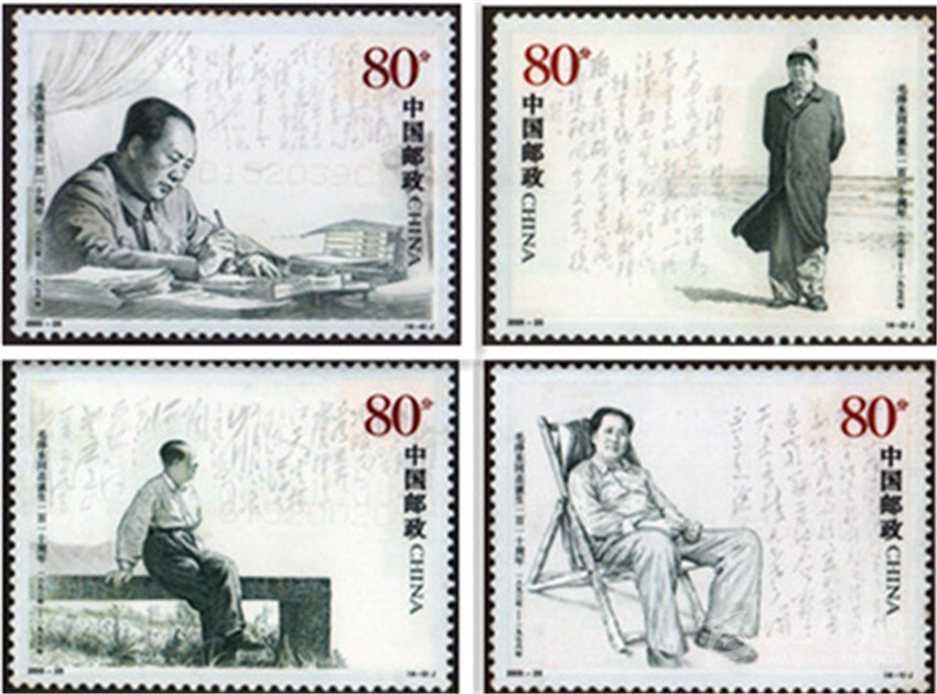 2003年12月6日, 中國郵政發(fā)行《毛澤東同志誕生一百一十周年》紀念郵票一套4枚,分別表現(xiàn)了毛澤東在西柏坡、毛澤東在北戴河、毛澤東在廬山、毛澤東在廣州的不同形象,背景以相應(yīng)的毛澤東詩詞書法襯托,偉人的豐姿躍然票上。這套以照片為基礎(chǔ)采用膠雕套印大票面黑白兩色的郵票,樸素大方,典雅大氣。郵票中的人物形象從面部表情到坐立姿態(tài),都顯出神采奕奕、栩栩如生。