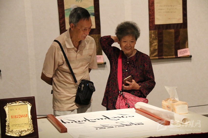 鋪紙、拿筆、蘸墨、彎腰.....15日上午,四川省工藝大美術(shù)師呷多繼續(xù)在現(xiàn)場演示藏文書法?!斑@種筆是特制的嗎?”“您寫的藏文是什么意思?”“學(xué)習(xí)藏文書法難不難?”觀展者們發(fā)出各種疑問。來自雙流的高先生表示,平日就對(duì)書法感興趣,能見到現(xiàn)場演示的藏文書法,毫無疑問讓他擁有了十分愉快的周末。