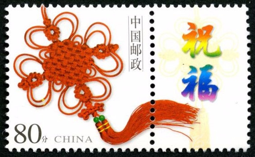 2002年5月10日,中國(guó)郵政發(fā)行《如意》個(gè)性化服務(wù)專用郵票一枚。主票圖案為如意柄端系著一個(gè)紅色“中國(guó)結(jié)”,附票有“祝福”二字; 2003年3月3日,中國(guó)郵政發(fā)行《同心結(jié)》個(gè)性化服務(wù)專用郵票一枚。主票圖案為盤(pán)長(zhǎng)結(jié)4邊編織有心型繩結(jié)的同心結(jié),附票為“祝?!倍?;2006年9月25日,中國(guó)郵政發(fā)行《中華全國(guó)歸國(guó)華僑聯(lián)合會(huì)成立五十周年》紀(jì)念郵票一枚。圖案為阿拉伯?dāng)?shù)字“5”與中華全國(guó)歸國(guó)華僑聯(lián)合會(huì)圓形會(huì)徽組成數(shù)字“50”,象征全國(guó)僑聯(lián)五十周年,背景畫(huà)面為淡淡的粉紅色“中國(guó)結(jié)”。寓意歸國(guó)華僑與全國(guó)人民血肉相連,同心同德共同建設(shè)美好家園;2013年8月8日,中國(guó)郵政發(fā)行一枚《美好祝?!焚R卡專用郵票,圖案為象征喜慶的紅色“中國(guó)結(jié)”;2014年9月20日,中國(guó)郵政發(fā)行《中國(guó)夢(mèng)(二)——民族振興》特種郵票,其中第四枚“民族團(tuán)結(jié)”,圖案中載歌載舞的各民族群眾上方有一個(gè)大紅的“中國(guó)結(jié)”,象征著各民族大團(tuán)結(jié)。