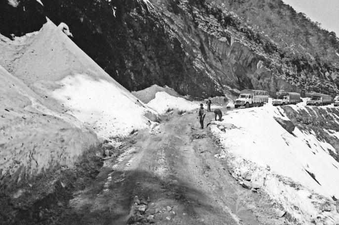 直到上世紀(jì)的七八十年代,人們要翻越二郎山,無疑還是把腦袋別在褲腰帶上的冒險之旅,彎急、坡陡、路窄、高反,再加泥濘濕滑,尤其艱難的是上半山那段路,兩道深深的車轍坑槽,車輛只能沿車轍上山,蝸牛般爬行,離開坑槽就意味著死亡,遇上錯車誰都不愿冒險出槽,越“雷池”一步。車速要快快不起來,想慢慢不下去,拿駕駛員們的話說就是:上山把踩油門的腳蹬進了油箱,車子跑不快,下山那怕是剎車踩死,車子還是停不下,堵車成家常便飯,拋錨隨時會有發(fā)生。
