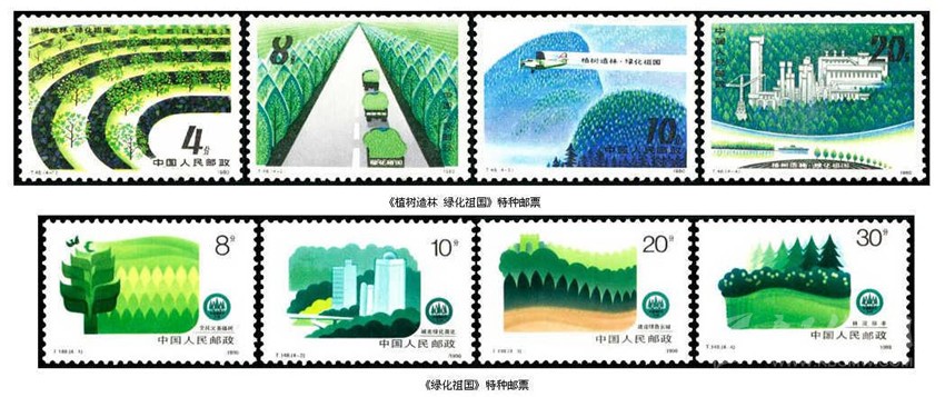 1980年3月12日,我國第一個植樹節(jié),中國郵政發(fā)行《植樹造林,綠化祖國》特種郵票,全套4枚。第一枚“經(jīng)濟(jì)林”,圖案是生長有序的梯田式的經(jīng)濟(jì)林林業(yè)基地。第二枚“四旁綠化”,即在宅旁、村旁、路旁和水旁因地制宜有計劃地種植經(jīng)濟(jì)林木以綠化城市、美化環(huán)境、護(hù)路護(hù)堤、凈化空氣以及為社會創(chuàng)造財富,圖中寬闊的道路兩旁綠油油的樹令人心情舒暢。第三枚“飛播造林”,圖案是在翠綠的群山間一架飛機(jī)正在向山嶺撒播樹種進(jìn)行造林,在飛機(jī)拉出的煙霧中有“植樹造林,綠化祖國”八個字,體現(xiàn)了我國植樹造林走全民動員和現(xiàn)代化的道路。第四枚“廠礦綠化”,廠礦置于一片綠色海洋之中,形成了美麗的園林化廠區(qū)。