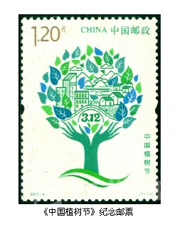 2019年是中國的植樹節(jié)設(shè)立40周年。3月12日,中國郵政發(fā)行一枚《中國植樹節(jié)》紀(jì)念郵票。郵票畫面以綠色為基調(diào),圖案主體為雙手托起的綠色家園,手臂代表樹干、張開的五指代表樹枝,寓意大家親自動手,植樹造林,為改善生活環(huán)境做出一份貢獻(xiàn),同時也寓意人類是肩負(fù)改善地球環(huán)境重任的主要力量。樹干枝頭上方是生機(jī)盎然的綠葉,層層綠葉中設(shè)計點綴了象征城鎮(zhèn)、鄉(xiāng)村、河流、山川、藍(lán)天白云、飛鳥的符號化圖形,寓意通過全民植樹造林活動,改善生態(tài)和生活環(huán)境,共同創(chuàng)造綠水青山的美麗中國。