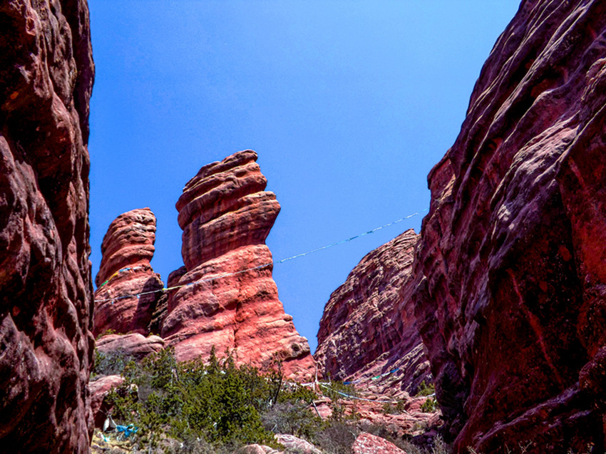 雄奇險(xiǎn)詭,怪石嶙峋,幽洞通天。高山之巔紅塔、石堡踞守,當(dāng)陽光照耀在這片紅色的世界,這片主要以丹霞石柱、峰林、石墻、崖壁等以及各種造型石為主的世界,就如同蓮花生大師的光明宮,絢麗多姿、雄奇而瑰麗。