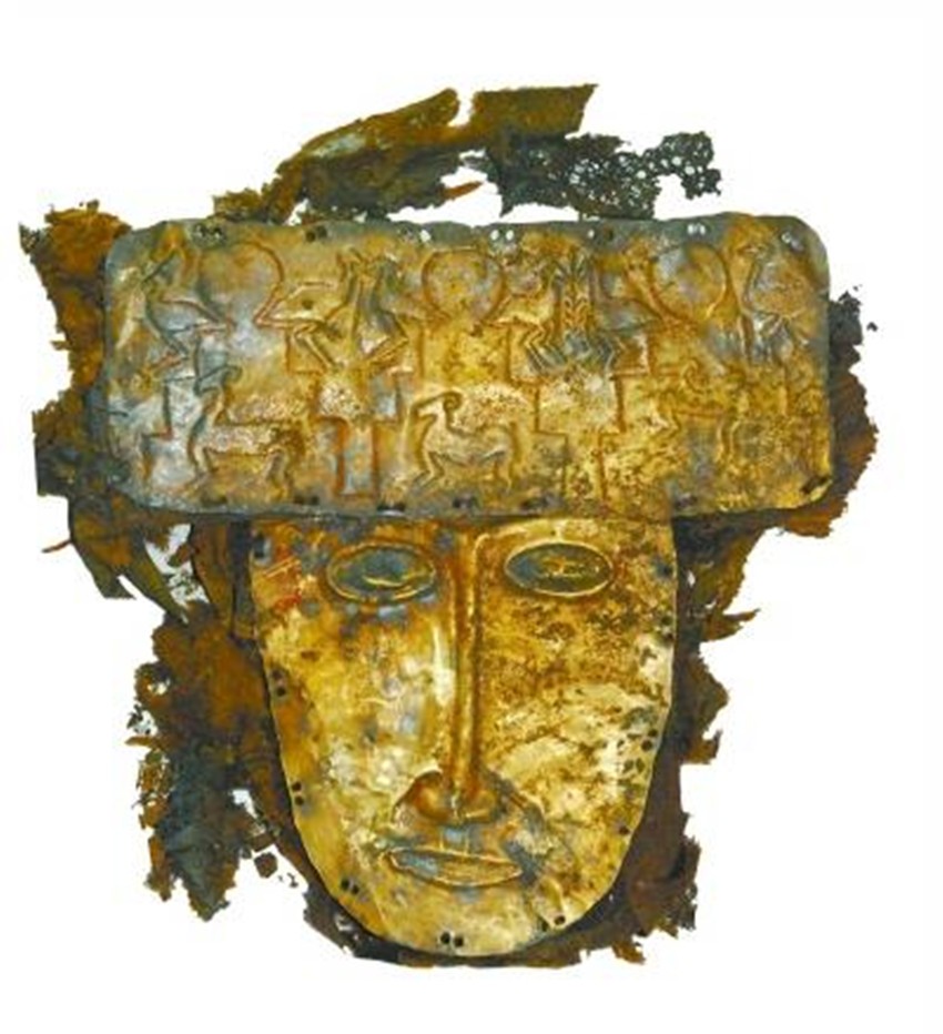 這是西藏天葬的早期形式?或是為了能夠更長久地保存而剔除軟組織,留下堅硬的尸骨?雖然我們對于這一葬俗的深層原因還不得而知,但可以推測,黃金面具最基本的功能可能是用以在尸骨最終埋入墓室時進行面部裝飾。用朱紅色的顏料涂在面具的五官輪廓上,可以創(chuàng)造出活生生的人的形象,用金燦燦的貴重金屬襯上金燦燦的絲綢覆面,打造出王者風范,既可以維護死者最后的尊嚴,也體現(xiàn)了他所擁有的財富和社會地位。