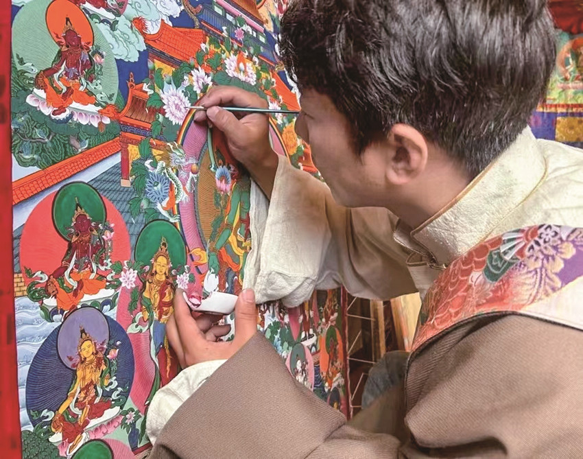 “唐卡作為中國民族繪畫藝術(shù)的珍品,不僅呈現(xiàn)精湛的技藝和美學(xué),更是傳遞一種文化?!睏畹潜硎?,他作為一名縣級非遺傳承人,要在繼承傳統(tǒng)技藝的基礎(chǔ)上,采用多元藝術(shù)技藝賦予傳統(tǒng)唐卡更多創(chuàng)意,讓民族文化瑰寶能夠更好地發(fā)揚光大。
