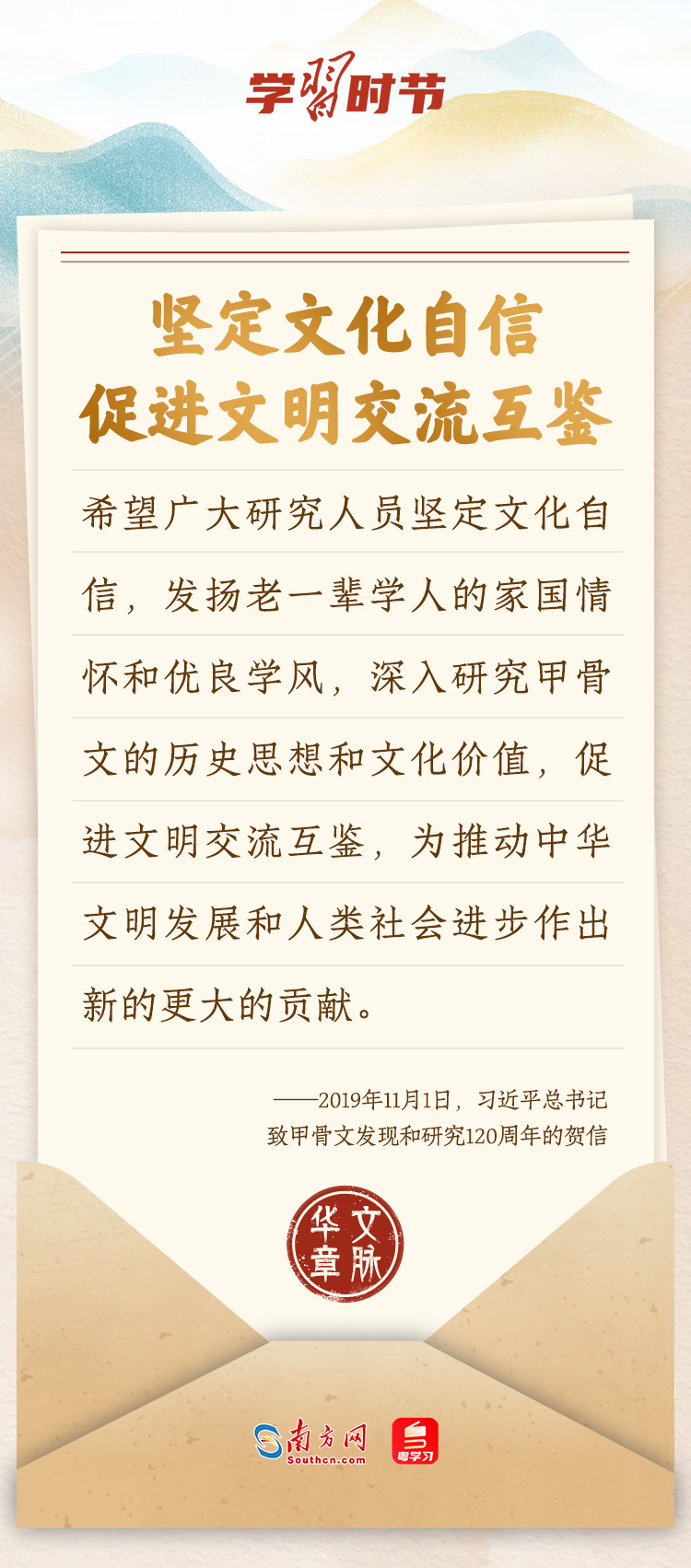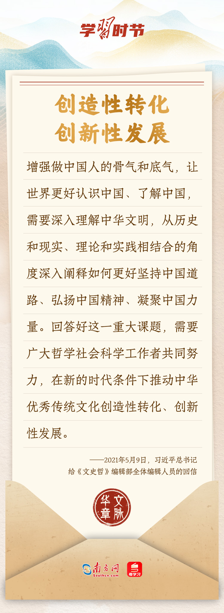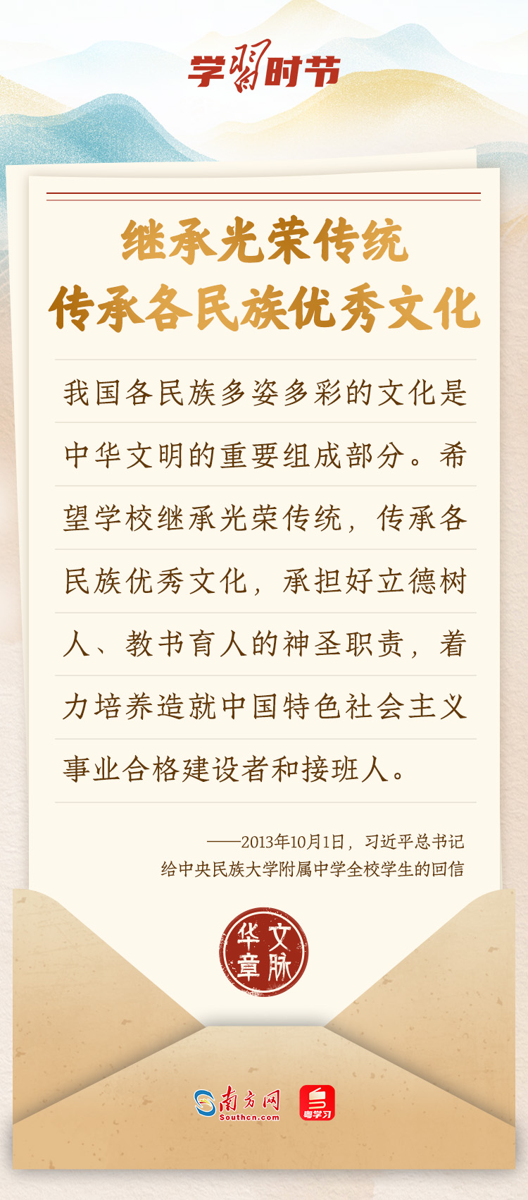 “中華民族在幾千年歷史中創(chuàng)造和延續(xù)的中華優(yōu)秀傳統(tǒng)文化,是中華民族的根和魂?!绷?xí)近平總書記多次通過(guò)發(fā)賀信、寫回信等方式,表達(dá)著對(duì)弘揚(yáng)中華優(yōu)秀傳統(tǒng)文化的殷切希望,飽含深情、字字暖心、催人奮進(jìn)。讓我們一起“讀”信。