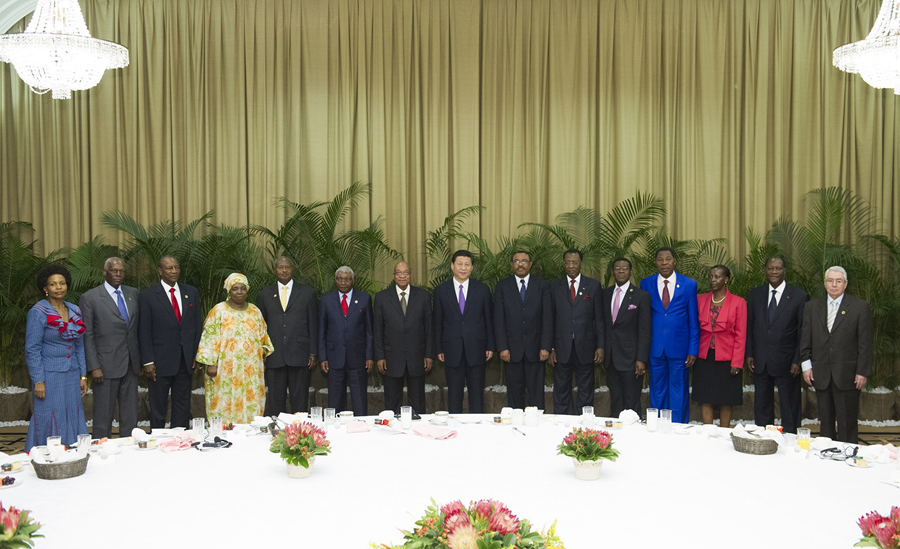 ??圖為2013年3月28日,國家主席習(xí)近平在南非德班同非洲國家領(lǐng)導(dǎo)人早餐會合影。新華社發(fā)