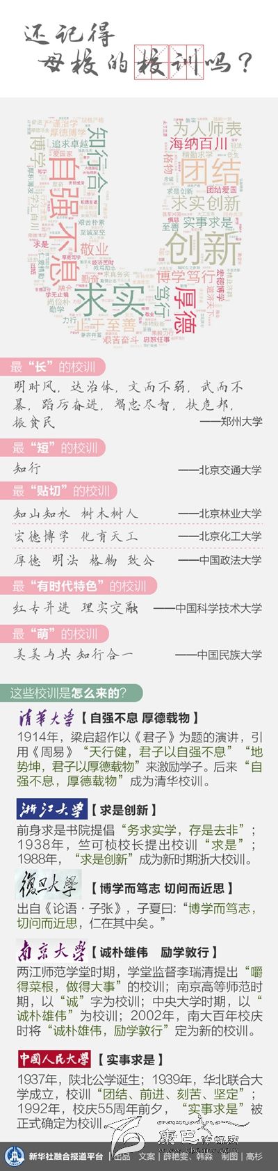 一份對100多所中國高等學(xué)府校訓(xùn)的統(tǒng)計(jì)顯示,出現(xiàn)頻次最高的詞是“求實(shí)”,其次是“創(chuàng)新”、“博學(xué)”、“厚德”,一個(gè)‘實(shí)’字始終貫穿于不同時(shí)代、不同環(huán)境的校訓(xùn)之中。