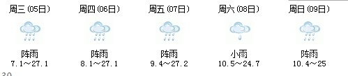5日開始一直到9日都是多云到晴的天氣,日最高氣溫27℃左右。每天都有陣雨(小雨),考生出行應防山地災害。