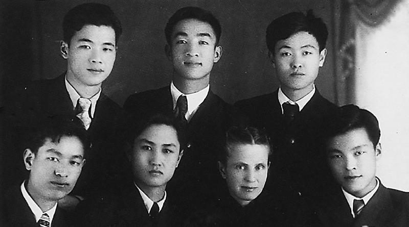 1949 年 6月1日,李鵬同志(后排左)在蘇聯(lián)伊萬(wàn)諾沃動(dòng)力學(xué)院補(bǔ)習(xí)數(shù)理化及俄文時(shí)與俄語(yǔ)教師費(fèi)德洛娃(前排左三)及同學(xué)合影。 新華社發(fā)
