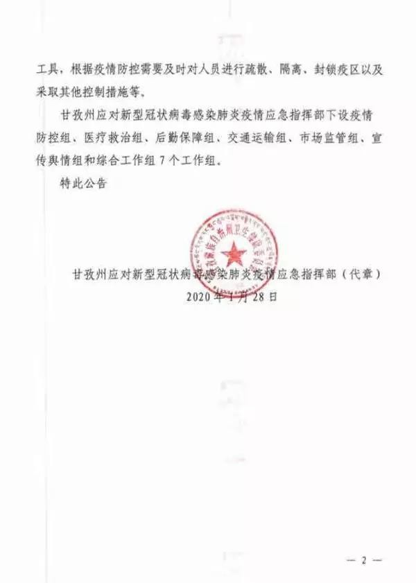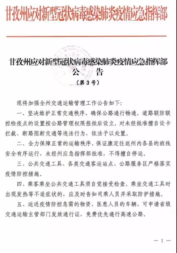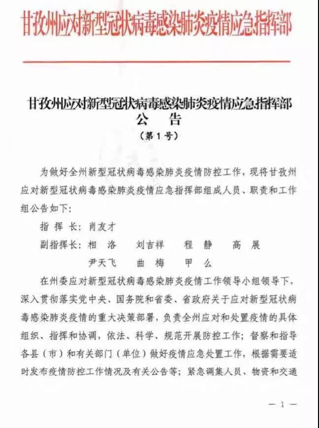 近日,甘孜州應(yīng)對新型冠狀病毒感染肺炎疫情應(yīng)急指揮部發(fā)布第1號、第2號、第3號公告。