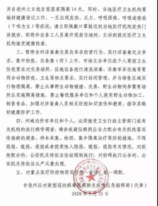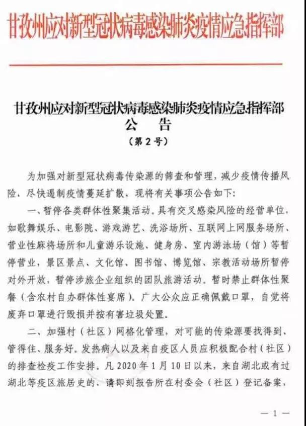 一、暫停各類群體性聚集活動。具有交叉感染風(fēng)險的經(jīng)營單位,如歌舞娛樂、電影院、游戲游藝、洗浴場所、互聯(lián)網(wǎng)上網(wǎng)服務(wù)場所、營業(yè)性麻將場所和兒童游樂設(shè)施、健身房、室內(nèi)游泳場(館)等暫停營業(yè),景區(qū)景點、文化館、圖書館、博覽館、宗教活動場所暫停對外開放,暫停涉旅企業(yè)組織的團隊旅游活動。暫時禁止群體性聚餐(含農(nóng)村自辦群體性宴席)。廣大公眾應(yīng)正確佩戴口罩,自覺將廢棄口罩進行毀損并按有害垃圾處置。二、加強村(社區(qū))網(wǎng)格化管理,對可能的傳染源要找得到、管得住、服務(wù)好。發(fā)熱病人以及來自疫區(qū)人員應(yīng)積極配合村(社區(qū))的排查檢疫工作安排。凡2020年1月10日以來,來自湖北或有過湖北等疫區(qū)旅居史的,請即刻報告所在村委會(社區(qū))登記備案,并自進州之日起自覺居家隔離14天。同時,當(dāng)?shù)蒯t(yī)療衛(wèi)生機構(gòu)要做好健康登記工作,一旦出現(xiàn)發(fā)熱、乏力、呼吸困難、呼吸道感染(干咳為主)等癥狀,請立即佩戴口罩就近到當(dāng)?shù)蒯t(yī)療機構(gòu)發(fā)熱門診就診。即將外出務(wù)工人員離開現(xiàn)居住地時,主動到就近醫(yī)療衛(wèi)生機構(gòu)接受健康檢查。三、暫停全州活畜禽交易及宰殺經(jīng)營行為,實行活畜禽定點宰殺、集中檢疫、白條禽(肉)上市。市場主辦單位或個人要按衛(wèi)生防疫要求對交易場所、設(shè)施設(shè)備進行清洗消毒,活禽宰殺設(shè)施等要符合動物防疫、衛(wèi)生等相關(guān)要求,實行封閉管理,并與銷售區(qū)域?qū)嵭形锢砀綦x。禁止從事野生動物捕獵、交易,野生動物飼養(yǎng)繁育場所應(yīng)實施隔離措施,禁止餐飲服務(wù)單位和個人使用野生動物加工、制售食品。加強對涉畜禽人員相關(guān)防控知識宣傳和教育,指導(dǎo)其做好健康防護工作。四、州域內(nèi)所有單位和個人,必須接受衛(wèi)生行政主管部門或有關(guān)機構(gòu)的流行病學(xué)調(diào)查,確診或疑似病例應(yīng)全力配合有關(guān)機構(gòu)落實傳染病的調(diào)查、樣本采集、檢測、集中隔離治療等防控措施,不得隱報、緩報、謊報或者授意他人隱報、緩報、謊報有關(guān)情況。對拒絕配合的,公安機關(guān)將依法協(xié)助強制執(zhí)行;對妨礙執(zhí)行公務(wù)的,公安機關(guān)將依法從嚴從重處理。五、對重點醫(yī)療防控物資實行統(tǒng)一收儲、統(tǒng)一調(diào)配。甘孜州應(yīng)對新型冠狀病毒感染肺炎疫情應(yīng)急指揮部