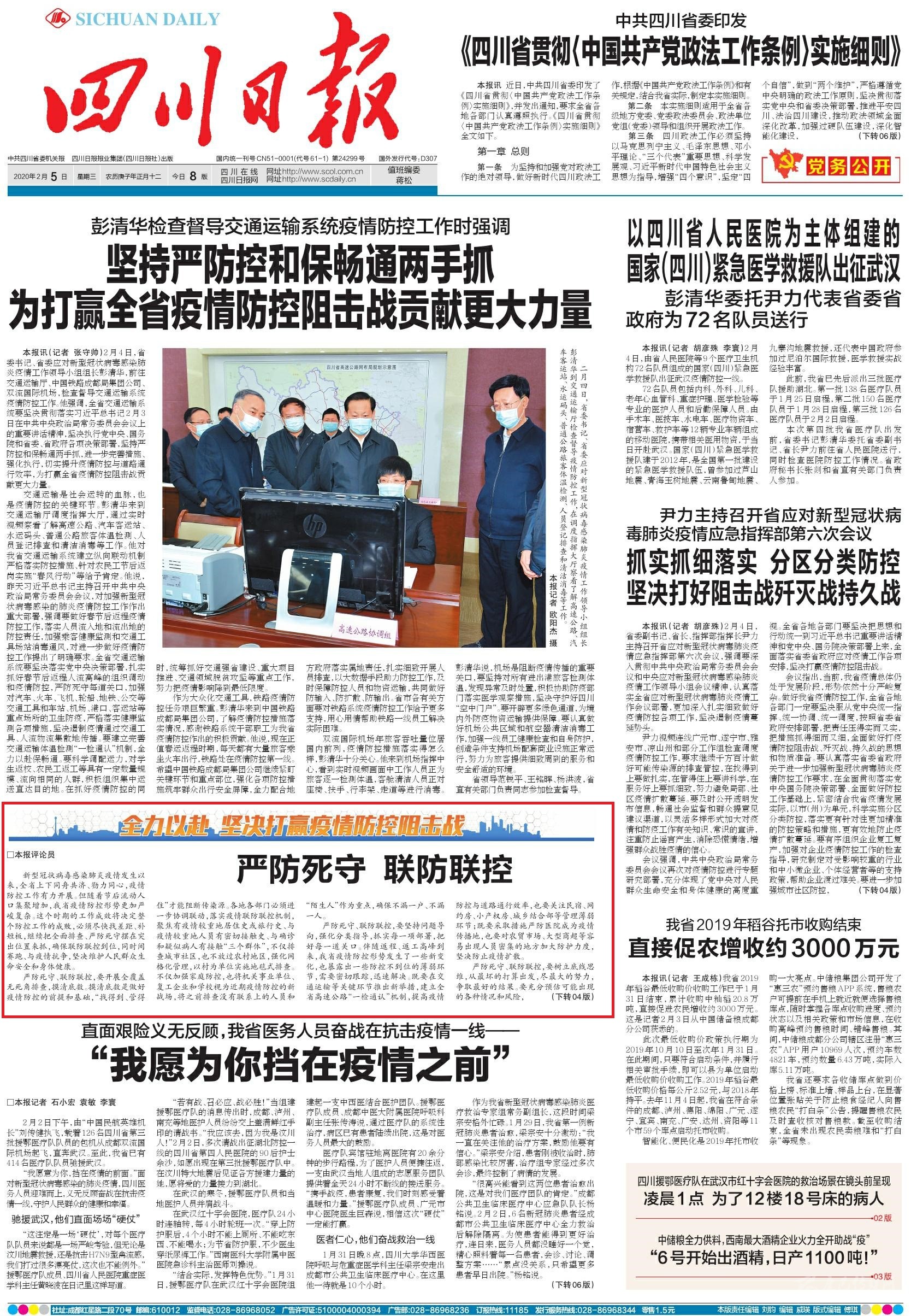 四川日?qǐng)?bào)訊2月3日是春節(jié)假期后上班第一天,四川省應(yīng)對(duì)新型冠狀病毒感染肺炎疫情工作會(huì)議在成都召開,省委書記、省委應(yīng)對(duì)新型冠狀病毒感染肺炎疫情工作領(lǐng)導(dǎo)小組組長彭清華出席會(huì)議并講話。他強(qiáng)調(diào),現(xiàn)在正是與時(shí)間賽跑、與疫情抗?fàn)幍木o要關(guān)頭,必須打一場(chǎng)嚴(yán)防死守的全域阻擊戰(zhàn)和全民保衛(wèi)戰(zhàn)。要堅(jiān)定貫徹習(xí)近平總書記重要指示精神和黨中央決策部署,把抓好疫情防控作為當(dāng)前最重要的工作、最緊迫的政治任務(wù),以更加有力的舉措推動(dòng)省委、省政府部署要求落地落實(shí),