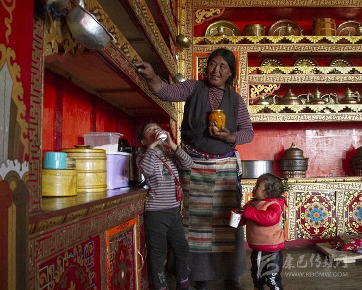 5月30日,四川甘孜藏族自治州理塘縣奔戈鄉(xiāng)卡灰村村民阿曲在家中照看外孫和外孫女。新華社記者 李夢馨 攝