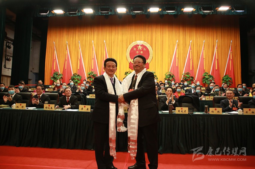 李康同志和向秋同志在州十二屆人大五次會上。