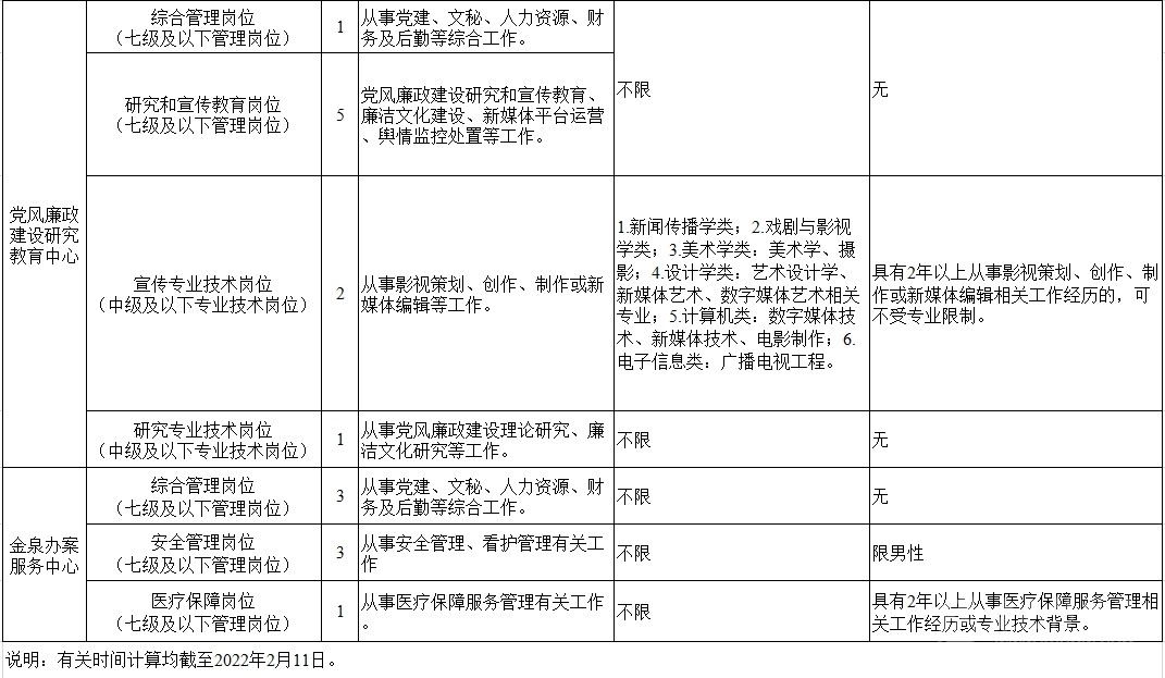 考調名額 考調事業(yè)人員25名。其中,信息技術中心管理崗位9名,黨風廉政建設研究教育中心管理崗位6名、專業(yè)技術崗位3名,金泉辦案服務中心管理崗位7名。 考調對象及條件 考調對象 全省范圍內行政單位或參公事業(yè)單位一級主任科員(含)以下職級及相當職務層次人員;縣級及以上公益一類或全額撥款事業(yè)單位管理崗位七級及以下職員、專業(yè)技術崗位中級及以下工作人員。 考調條件 具有良好的政治素質、專業(yè)素養(yǎng),品行端正,實績突出,群眾公認。 中共黨員。 全日制大學本科及以上學歷,并取得相應學士及以上學位。 年齡35周歲以下(1986年2月11日及以后出生)。 歷年年度考核均為合格(稱職)及以上。 身體心理健康,具有正常履行職責的身體條件和心理素質。 符合報考崗位規(guī)定的資格條件,詳見《中共四川省紀委四川省監(jiān)委2022年公開考調事業(yè)人員崗位情況表》(附后)。 符合法律、法規(guī)規(guī)定的其他條件。 有關時間計算均截至2022年2月11日。 具有下列情形之一的,不得報考: 被依法列為失信聯合懲戒對象的。 涉嫌違紀違法正在接受有關專門機關審查尚未作出結論的。 受過黨紀政務處分或司法機關刑事處罰的。 受到誡勉、組織處理等影響期未滿或期滿影響使用的。 按照有關規(guī)定,到定向單位工作未滿服務年限或有其他限制性規(guī)定的。 尚在試用期的。 按照相關規(guī)定應當回避的。 法律、法規(guī)規(guī)定的其他情形。 報名及打印準考證 2022年2月22日上午8:00至2月26日下午18:00,報名人員登錄四川省人力資源和社會保障廳官網(http://rst.sc.gov.cn/)首頁“人事考試”專欄進行網上報名,每人限報一個崗位。 對報名人員進行網上資格初審,通過資格初審者可于2022年3月1日上午8:00至3月2日下午18:00,登陸報名系統打印筆試準考證。 考試 考試分筆試和面試。其中,信息技術崗位A、信息技術崗位B、宣傳專業(yè)技術崗位需加試專業(yè)測試。 根據筆試情況,擇優(yōu)確定進入面試的人選,并適時開展資格復審和心理素質測試。資格復審、心理素質測試、面試時間和地點另行電話通知。 考察、體檢及試用 考察 根據考試情況,擇優(yōu)差額確定進入考察對象,深入考察了解人選政治表現、工作能力、廉潔自律和性格特點等。 體檢 根據考察情況和職位要求,擇優(yōu)等額確定進入體檢人選,參照《公務員錄用體檢通用標準(試行)》進行體檢。 頂崗試用 綜合人選考試成績、考察情況,根據工作需要和人崗相適原則,擇優(yōu)確定頂崗試用人選。 調入 試用期滿后,根據考調名額和試用期間表現,研究確定擬調人員,經公示后按規(guī)定程序辦理調入手續(xù)。 注意事項 報考者應保證提供真實、準確、全面的個人信息和資料,如有弄虛作假的行為,將按有關規(guī)定嚴肅處理。 資格審查貫穿考調全過程,任一環(huán)節(jié)發(fā)現有不符合考調條件的,取消考調資格。 報名時請按要求填寫本人手機號碼,并保持通訊暢通。未入圍下一環(huán)節(jié)人員,不再另行通知。 進入資格復審者,需由有干部管理權限的主管部門出具同意考調的書面意見并加蓋公章。 嚴明考調紀律,報名者不得托人說情、打招呼,一經發(fā)現即取消資格。 遵守疫情防控相關規(guī)定,服從工作人員安排。 同時,四川省紀委監(jiān)委還提供相關咨詢電話:028—62555435;62555354。 (點擊查看大圖)