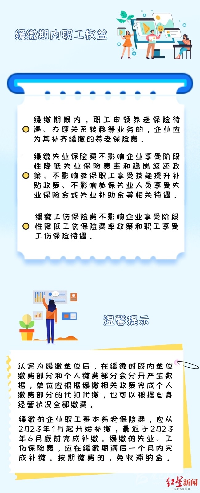 緩繳期限內,職工申領養(yǎng)老保險待遇、辦理關系轉移等業(yè)務的,企業(yè)應為其補齊緩繳的養(yǎng)老保險費。緩繳失業(yè)保險費不影響企業(yè)享受階段性降低失業(yè)保險費率和穩(wěn)崗返還政策、不影響參保職工享受技能提升補貼政策、不影響參保失業(yè)人員享受失業(yè)保險金或失業(yè)補助金等相關待遇。緩繳工傷保險費不影響企業(yè)享受階段性降低工傷保險費率政策和職工享受工傷保險待遇,要切實維護好職工權益。