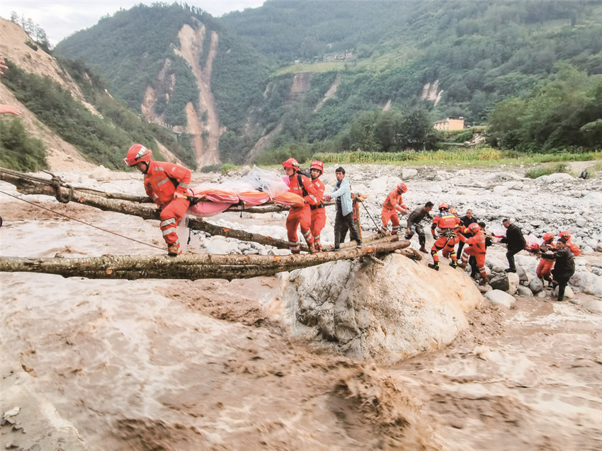 道路中斷、信號(hào)中斷,河流上漲、橋梁垮塌?!皼](méi)有橋,我們的雙手就是橋?!标P(guān)鍵時(shí)刻,四川省森林消防總隊(duì)甘孜支隊(duì)消防員兵分兩路實(shí)施營(yíng)救。一路“繩為引、步為尺”先期過(guò)河救治傷員,一路就地取材急流上用樹干搭起“生命通道”,自制擔(dān)架將傷員一一運(yùn)送過(guò)河;截至5日晚23時(shí)40分,甘孜森林消防隊(duì)員們翻山越嶺往返近7小時(shí),安全轉(zhuǎn)運(yùn)重傷員24人、近200名群眾,徒步行程18公里。