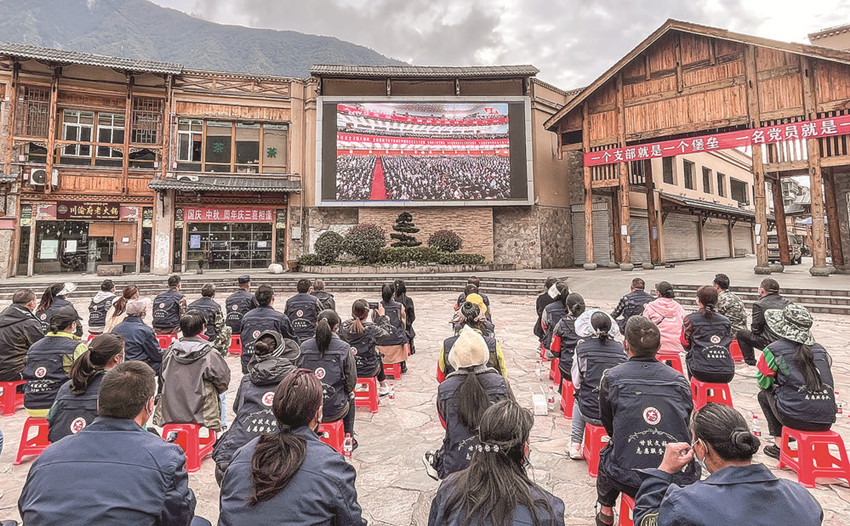 海螺溝干部群眾在貢嘎廣場收看黨的二十大開幕會。 海宣 攝