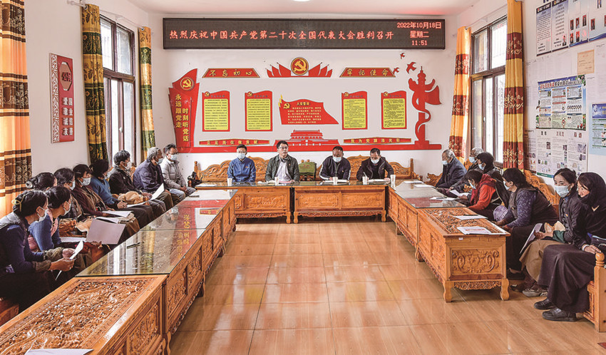 甘孜日?qǐng)?bào)社黨委工作組與稻城縣噶通鎮(zhèn)干部群眾熱議黨的二十大報(bào)告。