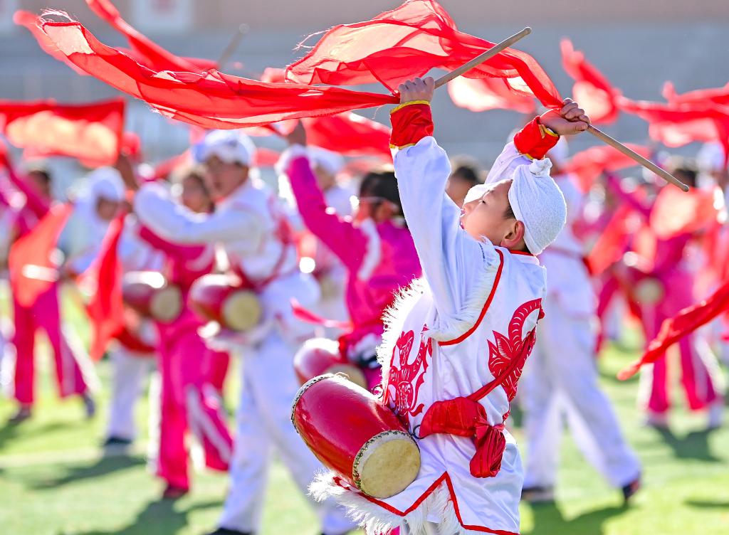 ??2023年11月16日,內(nèi)蒙古鄂爾多斯市鄂托克前旗第二小學的學生在大課間表演安塞腰鼓。該校將安塞腰鼓列入學校的校本課程和大課間活動,聘請民間藝人傳授技藝,讓非遺文化在校園中傳承。新華社發(fā)(王正攝)