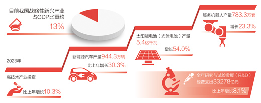 發(fā)展壯大戰(zhàn)略性新興產(chǎn)業(yè)。“戰(zhàn)略性新興產(chǎn)業(yè)具有創(chuàng)新活躍、技術(shù)密集等特點(diǎn),為新質(zhì)生產(chǎn)力發(fā)展壯大提供了巨大空間?!备呶拇碚f,近年來(lái),我國(guó)戰(zhàn)略性新興產(chǎn)業(yè)蓬勃發(fā)展,目前戰(zhàn)略性新興產(chǎn)業(yè)占GDP比重約13%。