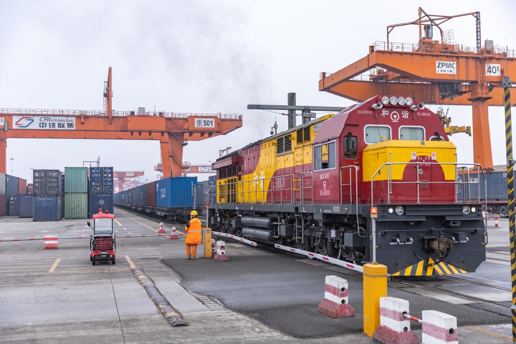 ??3月7日,一列滿載機(jī)械設(shè)備、整車及零部件等貨物的中歐班列在重慶團(tuán)結(jié)村中心站等候發(fā)車。新華社記者 黃偉 攝