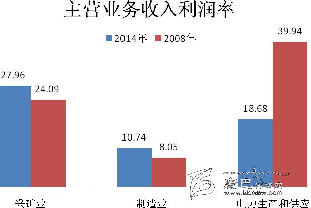 2013年,規(guī)模以上工業(yè)企業(yè)法人單位總資產(chǎn)貢獻率為8.46%,比2008年下降4.56個百分點。主營業(yè)務(wù)收入利潤率為18.83%,比2008年下降11.12個百分點。其中,采礦業(yè)為27.96%,比2008年上升3.87個百分點;制造業(yè)為10.74%,比2008年上升2.69個百分點;電力、熱力、燃氣及水生產(chǎn)和供應(yīng)業(yè)為18.68%,比2008年下降21.26 個百分點(詳見表2-4)。