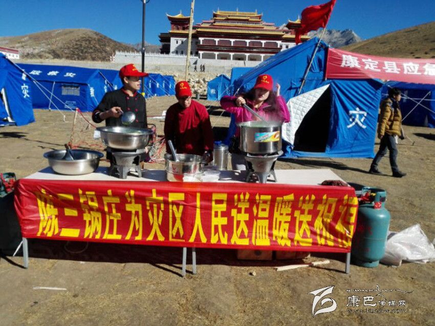 11月28日中午,記者來到康定塔公鎮(zhèn)祖慶小學(xué)采訪。在現(xiàn)場,一群戴著紅帽子的人正在將熱氣騰騰的紅燒肉一勺一勺的分發(fā)到同學(xué)們碗中。仔細一看,現(xiàn)場還有一幅標語,上面寫著“陳三鍋莊為災(zāi)區(qū)人民送溫暖送祝福”的字樣。記者揉了揉眼,確定沒看錯。原來,陳三鍋莊是關(guān)了康定的門店,組織人員到災(zāi)區(qū)參與抗震救災(zāi)來了。