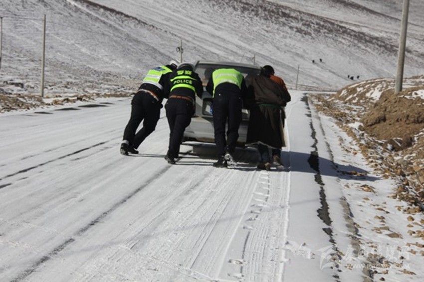 石渠縣公安局交警大隊(duì)民警大年三十巡邏時(shí)幫助群眾推車 獲群眾好評(píng)。