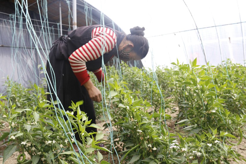 工人正在大棚里整理辣椒。