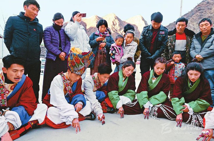 2017年12月22日,白玉縣城陽光普照,縣藝術(shù)團一群“90后”藏族演員用顏料相互在食指和中指上熟練地繪制著具有當?shù)孛袼滋厣娜宋飯D案。音樂響起,演員們的手指隨著節(jié)拍翩翩起舞,左挪右轉(zhuǎn)。隨著唱詞和曲調(diào)的變化,手指的動作幅度和節(jié)奏也隨之變化。藝人的情感起伏、喜怒哀樂被“小人”般的手指表現(xiàn)得淋漓盡致。