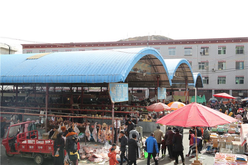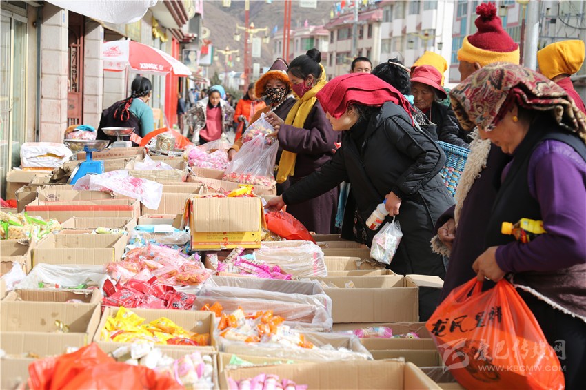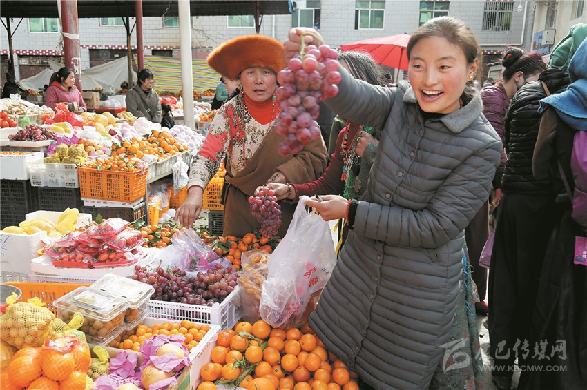 新都鎮(zhèn)格色村的丹真大哥和老伴兒其吉牽著8歲的孫子正在干果店里挑選各類干果,身后的背簍里水果、蔬菜、酥油、牛肉等農(nóng)畜產(chǎn)品以及中國結(jié)、年畫、對聯(lián)、掛圖等吉祥的節(jié)日物品應有盡有。