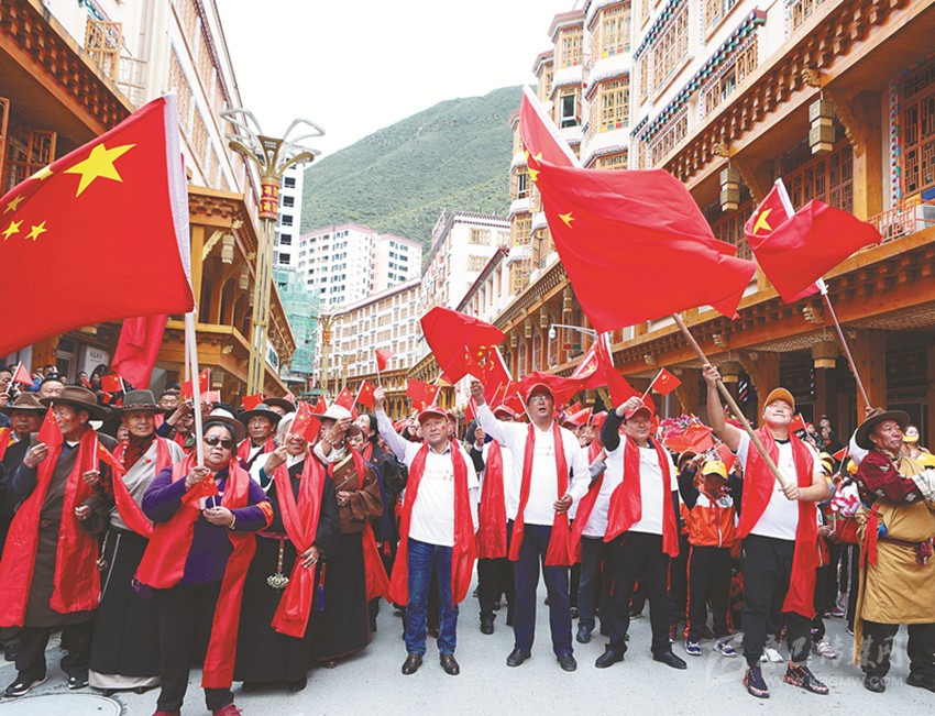 伴隨著悠揚的旋律,在當?shù)馗袼_爾藝術團演員的帶領和感染下,幾千名當?shù)馗刹咳罕娚碇A服,揮舞著手中的五星紅旗,懷著無比激動的心情獻歌祖國,同唱《我和我的祖國》。深情激昂的歌聲感染到在場的每一個人,有的高呼喝彩、有的熱淚盈眶,齊聚在鮮紅的國旗下,齊聲高喊:“我愛祖國,祖國萬歲!”